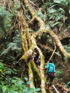| NOTES: | This is a recently damaged structure. As recently as 2013 it was the only known example of a triple span living root bridge. Sadly, a landslide occurred sometime in 2013 or 2014, completely destroying one span, damaging another beyond usability, and putting the overall health of the tree in question. The surviving span still seems to be in relatively good health. It is the highest living root bridge included in this study, and is being actively maintained. |