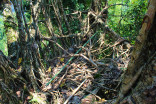 Here, a living root platform has been made from a ficus elastica tree next to the Kudeng Rim Village football field. According to sources in Kudeng Rim, the platform came about via a slow and unplanned process in which local children, who would climb the tree to relax and watch football, started winding aerial roots together until the roots bound with one another and formed a functional platform. Over time, as the platform increased in size and strength, more people could both use it, and continue expanding it. They continue to do so to this day. The tree shows considerable latex extraction damage. |