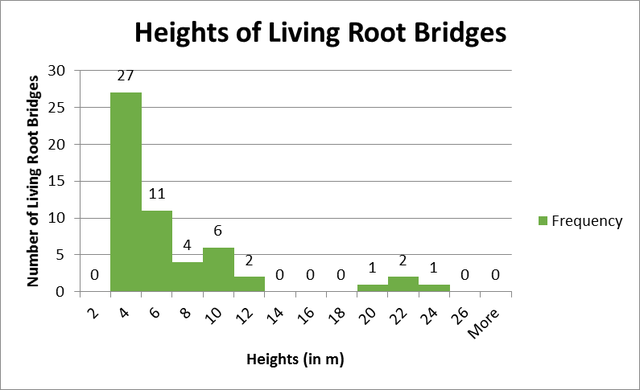 The graph above shows that 38 out of 54, or about 70% of bridges included in this study are between 2 and 6 m in height, with the remaining 30% widely dispersed between 6 and 24 m. Additionally, exactly half of the entries are in the narrow range of 2 to 4 meters in height. In general, it can be said root bridges with heights of over 10 meters are rare.