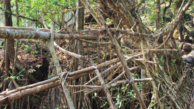 In these instances, young ficus elastica roots can often be seen twisted around bamboo poles, while sticks and tree trunks are used to add additional stability to a temporary structure which crosses a stream and is used to aid in the formation of a botanical structure. While these materials rot quickly in the hot, humid, climate of Southern Meghalaya, given their ubiquity, they can easily be replaced from year to year.