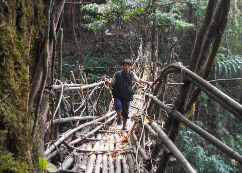 The slideshow below depicts a root bridge which existed as a few strands strung across a stream in 2015, though it was later significantly developed using a bamboo and wood scaffold.