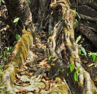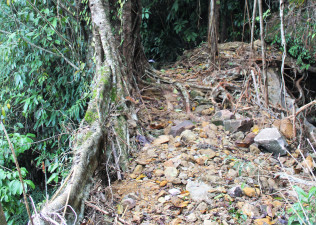 This is a living root bridge which was severely damaged by a landslide caused by road construction. The photo to the left shows the root bridge covered in debris. The picture to the right shows specific damage caused to the organism by the landslide. The landslide was triggered after heavy rain dislodged material from a hillside which had been destabilized by road building.